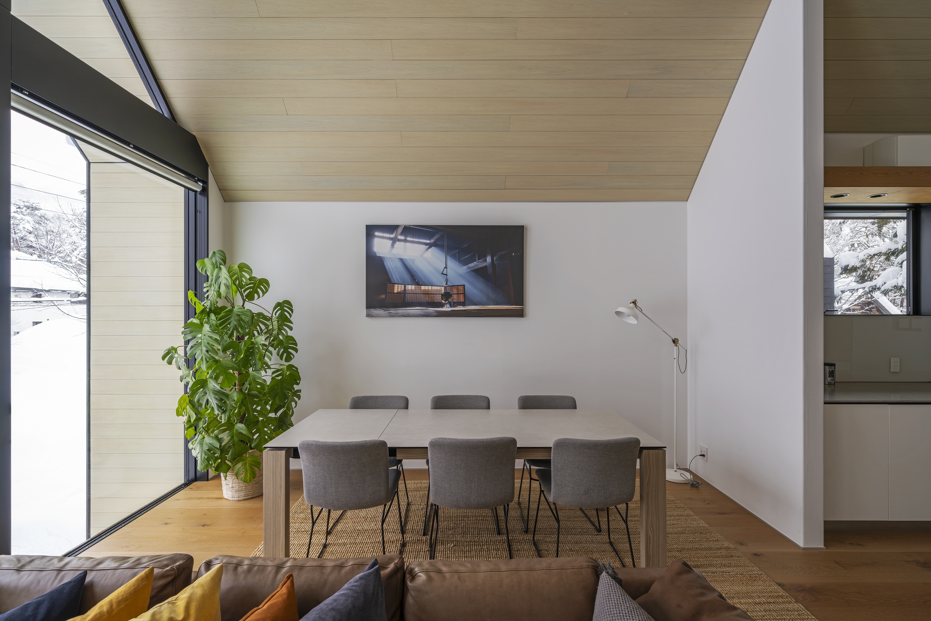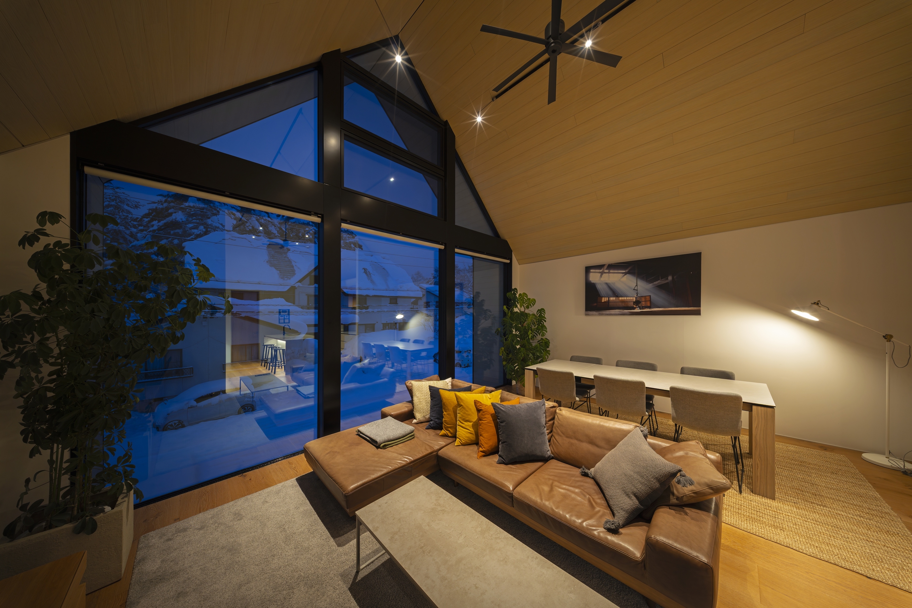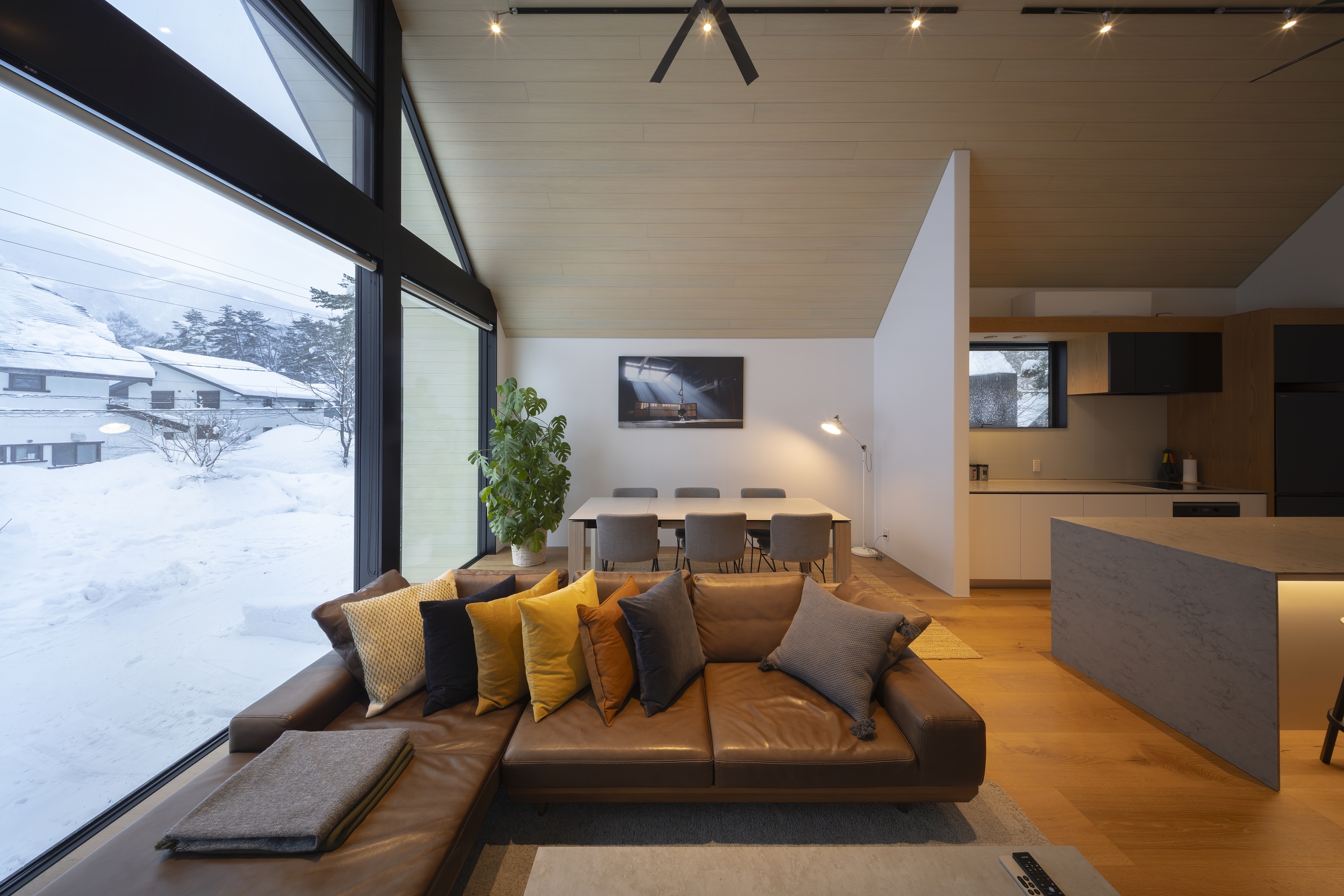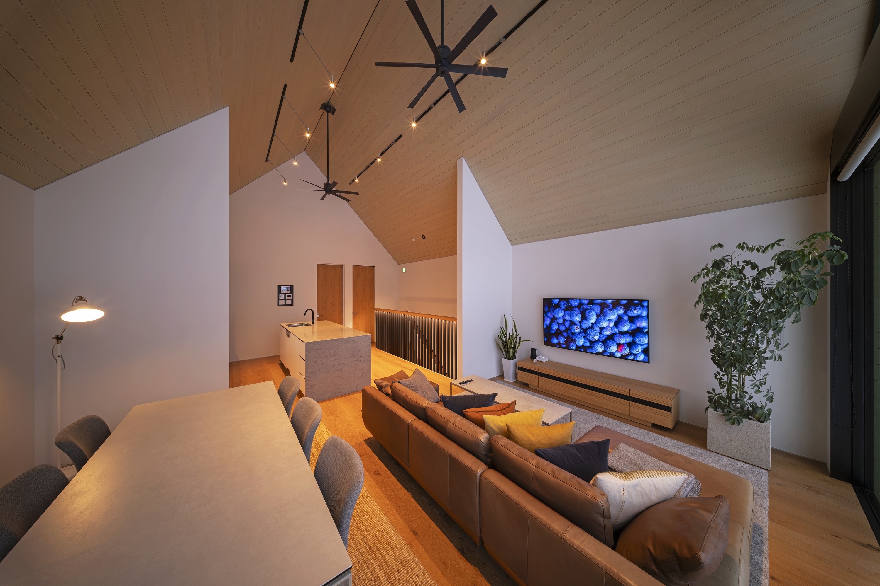 リゾート滞在の心地よさと、ラグジュアリ感を大切にしたプロミネンス。 シーリングファン付きの明るいリビング・ダイニングからアイランドつきのキッチンへはオープンスタイルで開放感が。 大きな窓からは冬は白銀の景色を、夏は白馬の緑を楽しめます。エアコン(リビング・ダイニング・キッチン)、床暖房(全館)付き。