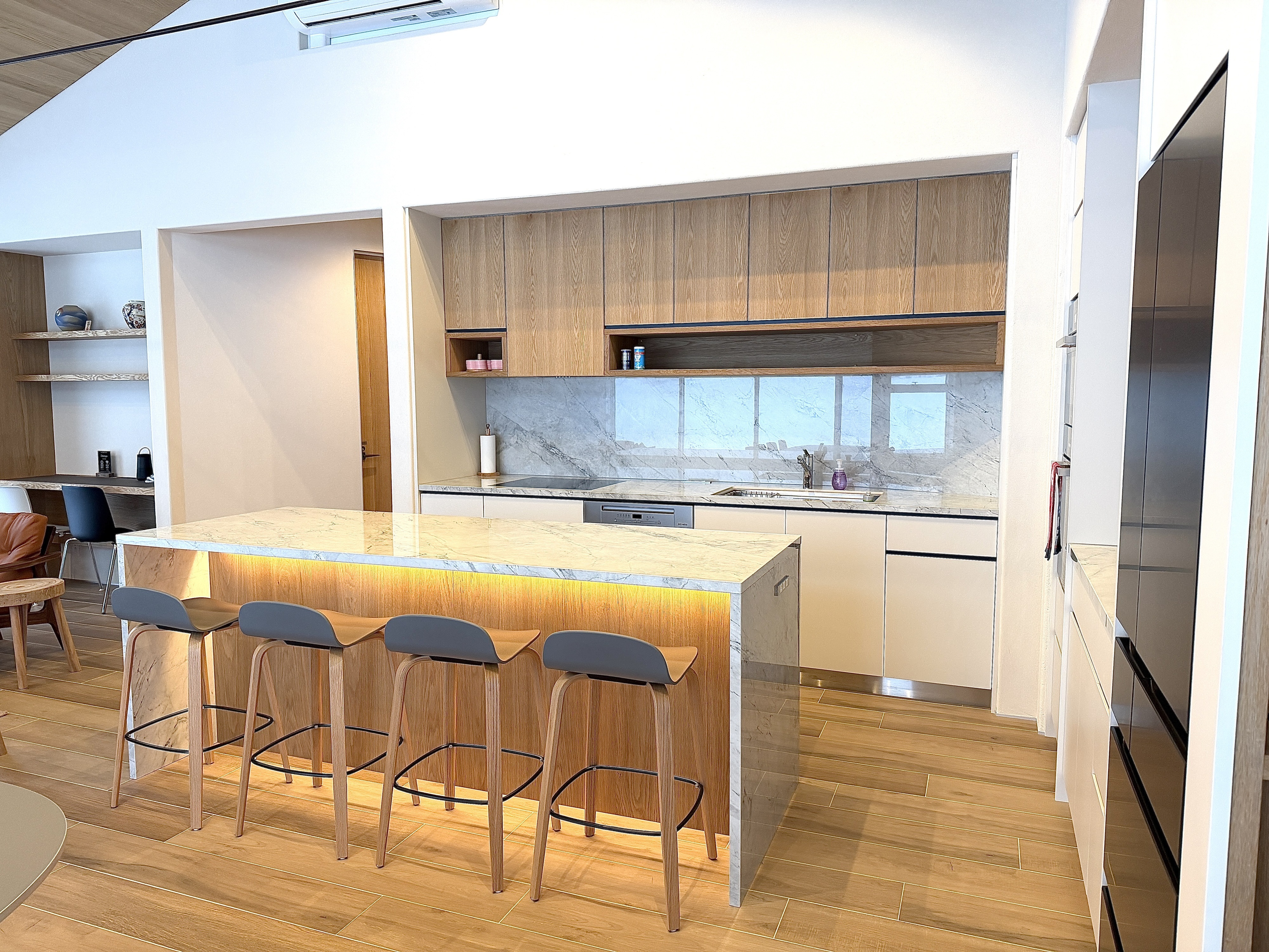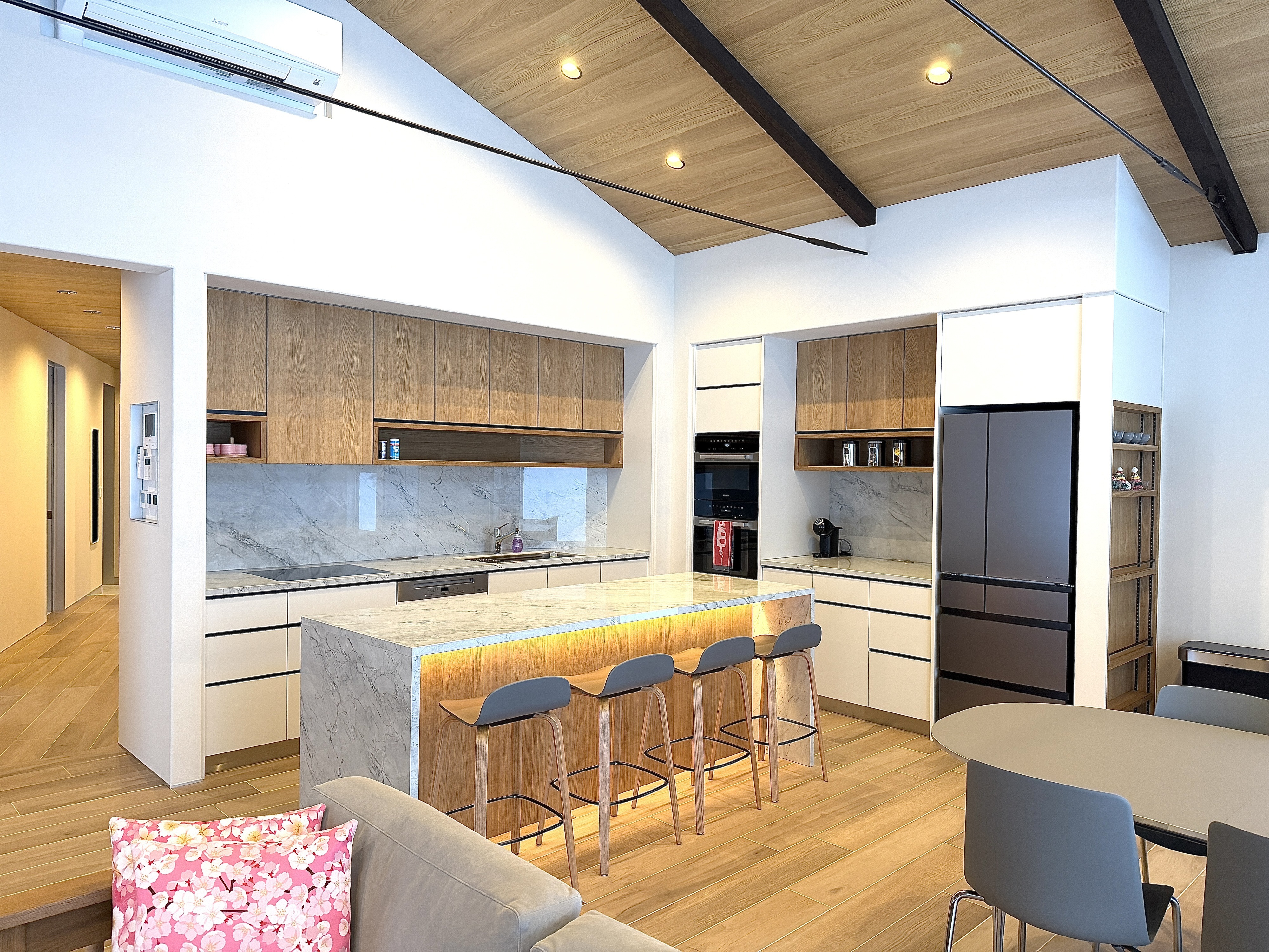 - キッチン:オープンスタイルのキッチンは大理石調の大型アイランド付き。Miele製オーブン・IHクックトップ・大型食洗機に加え、必要な各調理器具や食器が人数分揃います。