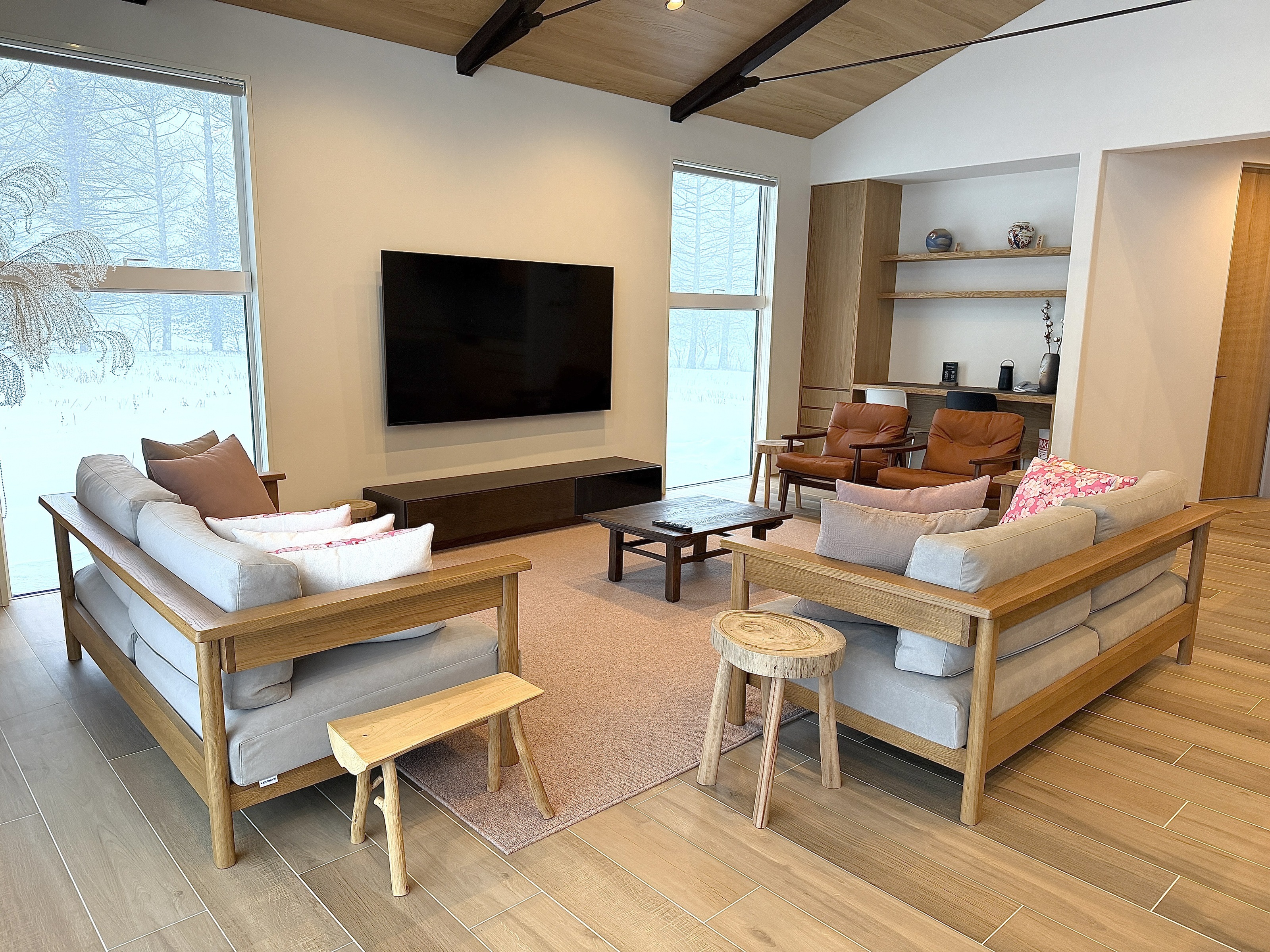 広々としたオープンプランのリビング・ダイニングエリアは、大きな窓から自然光が降り注ぎ、四季折々の美しい景色をお楽しみいただけます。設備が整ったキッチン、上質な家具、洗練されたデザインのバスルームが、快適で温かみのある空間を提供し、1日の終わりに心地よくおくつろぎいただけます。